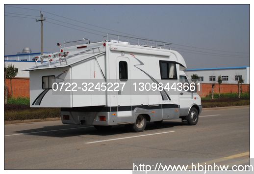 依維柯房車:依維柯房車采用依維柯廂式車底盤NJ1046SFX6型配以SOFIM8140.43S3 92KW/125馬力柴油發(fā)動(dòng)機(jī)改裝而成,廂體配置帶有車載專用空調(diào),帶有40L冰箱一臺(tái),液化氣熱水器一臺(tái),液化氣鋼瓶?jī)蓚€(gè),以便于更換,帶有便攜式馬桶,配有兩個(gè)(一大一小房車專用)換氣扇,另帶有房車專用燃?xì)庠睿?2V房車專用抽油煙機(jī),帶有進(jìn)口無(wú)桿遮陽(yáng)棚,可變床的活動(dòng)沙發(fā),茶幾,窗戶,吊柜各一套,鏡子,洗臉盆,灶臺(tái)各一套,凈水箱和污水箱各一套,蓄電瓶?jī)蓚€(gè),停電寶一個(gè),室內(nèi)環(huán)境燈兩個(gè),19寸液晶電視一臺(tái),后擴(kuò)展臥室,另配有倒車?yán)走_(dá),導(dǎo)航系統(tǒng)各一套?;灸軡M足2-5人在野外的生活保障,是驢友野外露營(yíng),外出探險(xiǎn)的最佳車型。